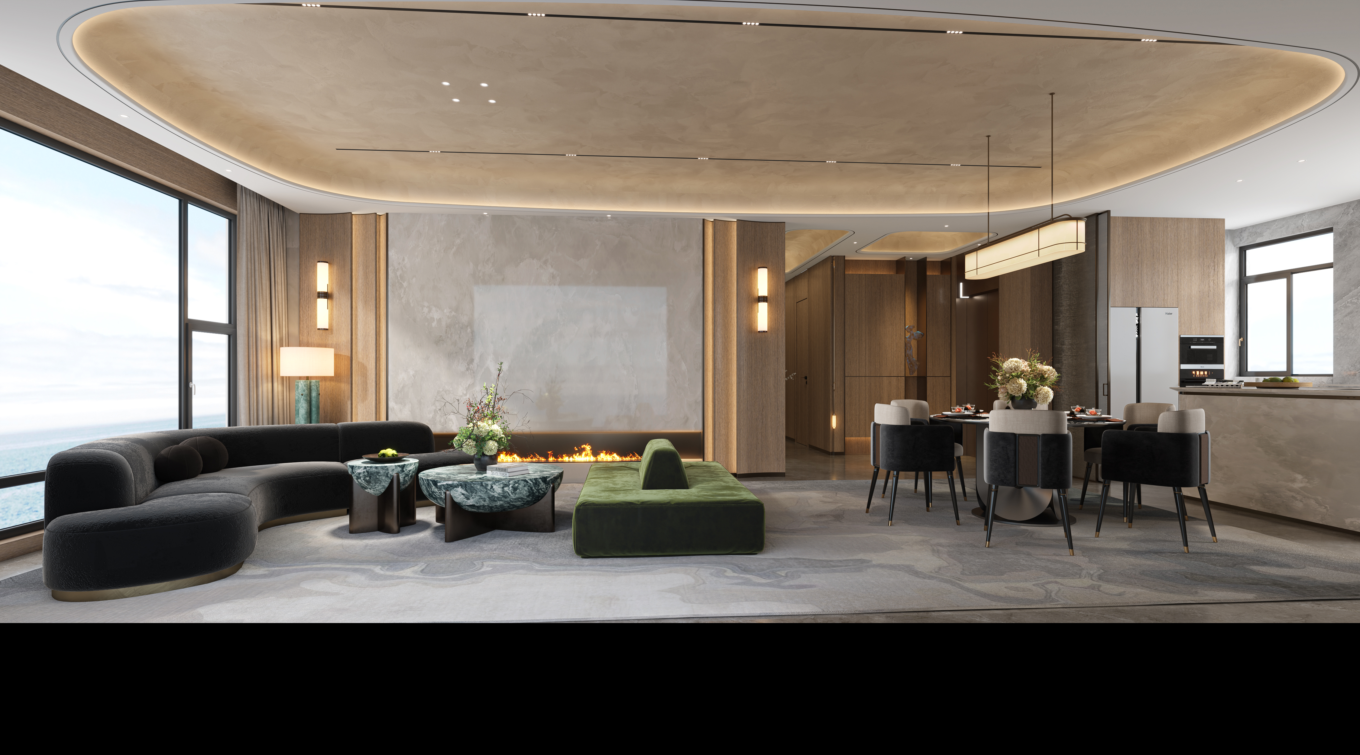 立面为落地玻璃幕墙,透明材质让自然延伸入室,空间金属、艺术装置与曼妙光线相互渗入,塑造流动的韵律,为空间增添生机与活力。